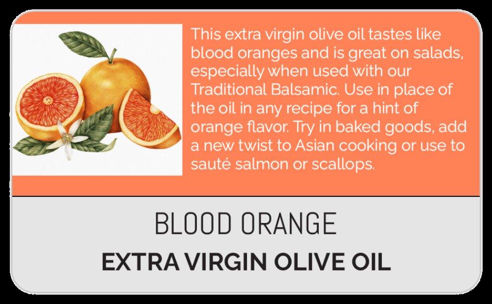 Description: This extra virgin olive oil tastes like blood oranges and is great on salads, especially when used with our Traditional Balsamic. Use in place of the oil in any recipe for a hint of orange flavor. Try in baked goods, add a new twist to Asian cooking or use to sauté salmon or scallops.