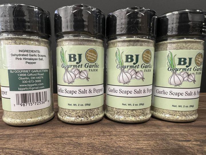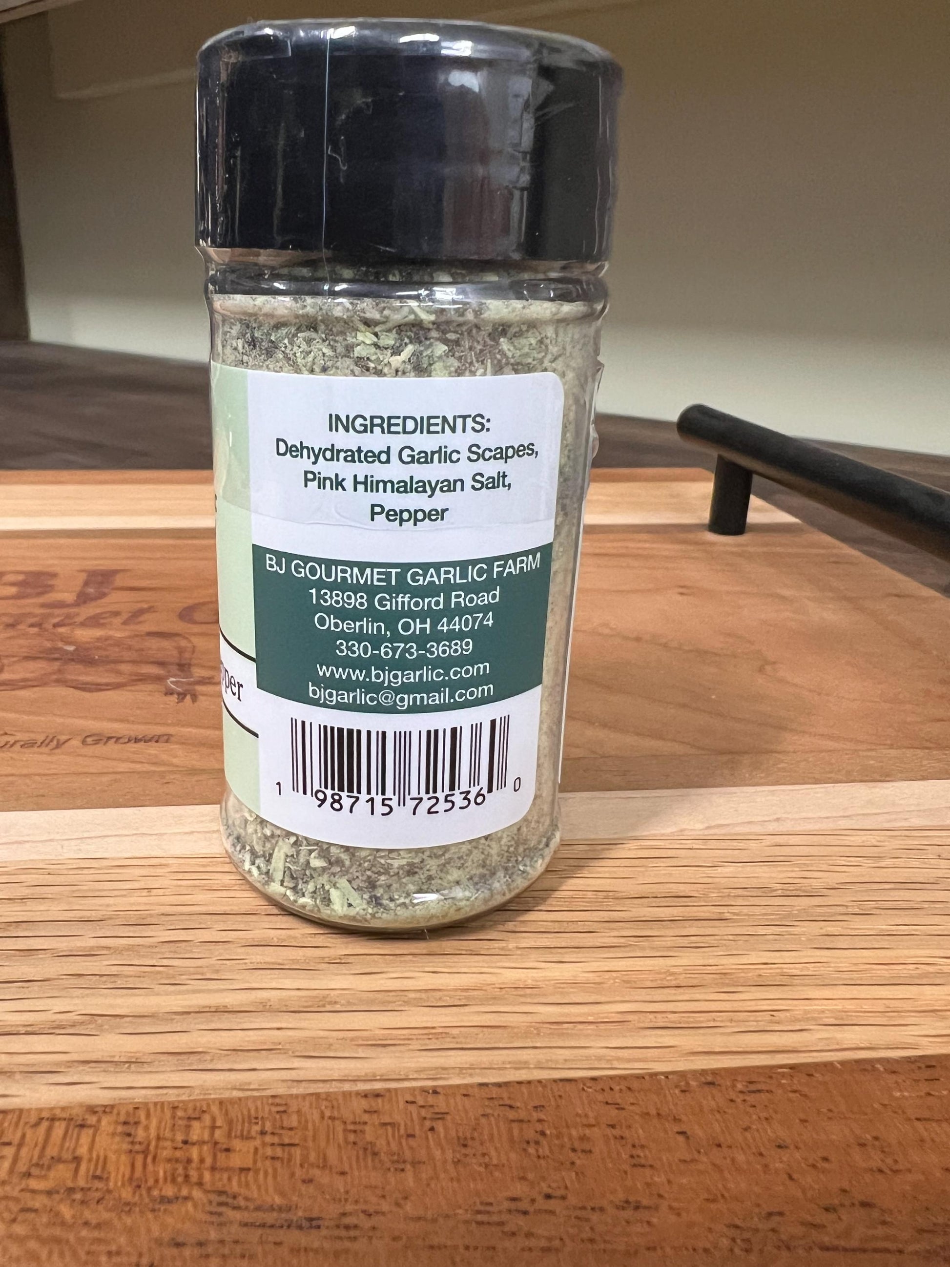 3.5 oz. Shakers filled with fresh garlic scape powder from this years harvest, along with pink himalayan salt and black pepper. Easy on the stomach for those who cannot handle garlic from the bulbs. Get you garlic flavor with no stomach discomfort!