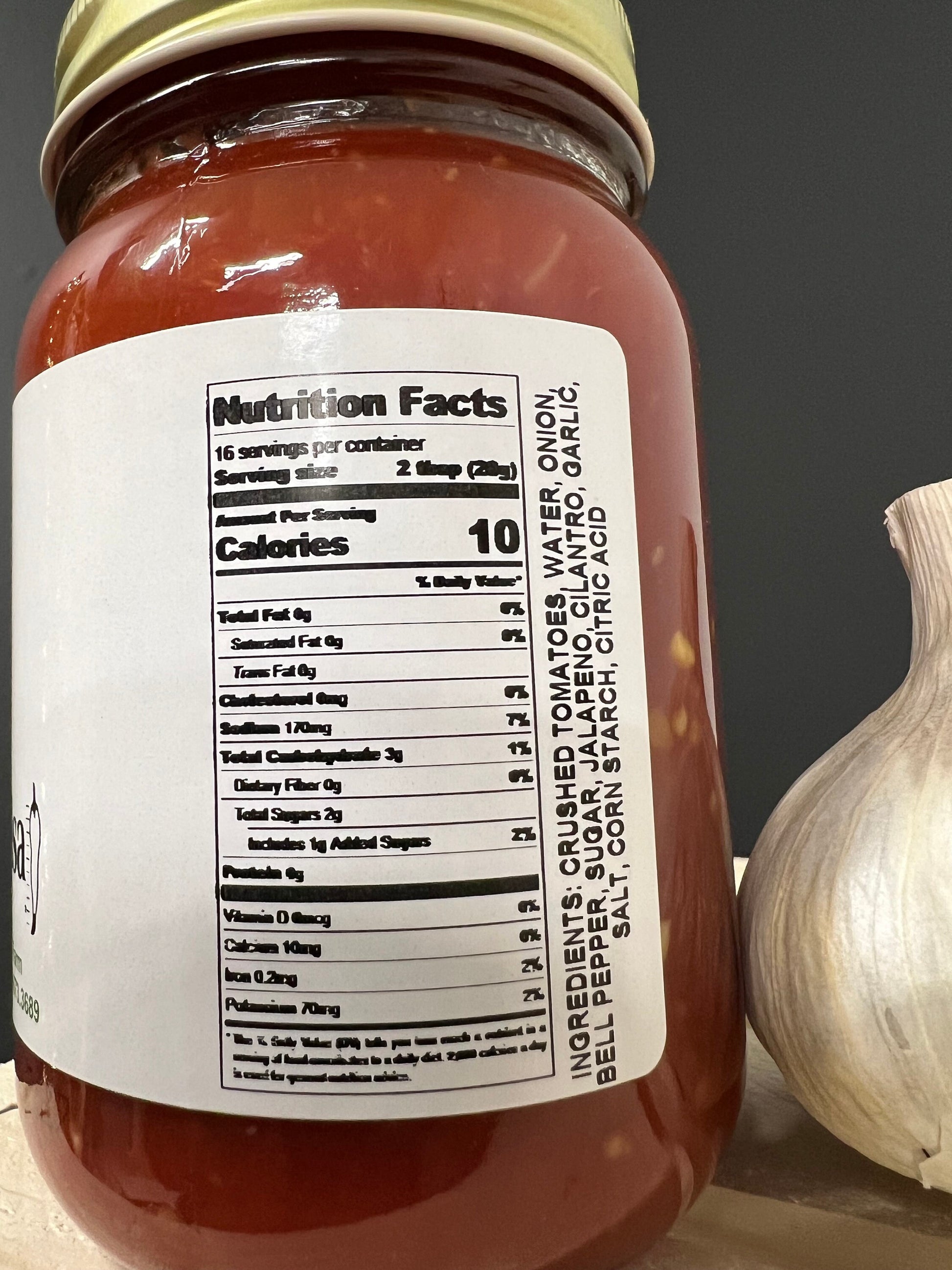 Ingredients: Tomatoes, Diced Tomatoes, Water, Vinegar, Onions, Bell Peppers, Garlic, Salt, Jalepenos, Corn Starch, Brown Sugar, Cilantro, Cumin.