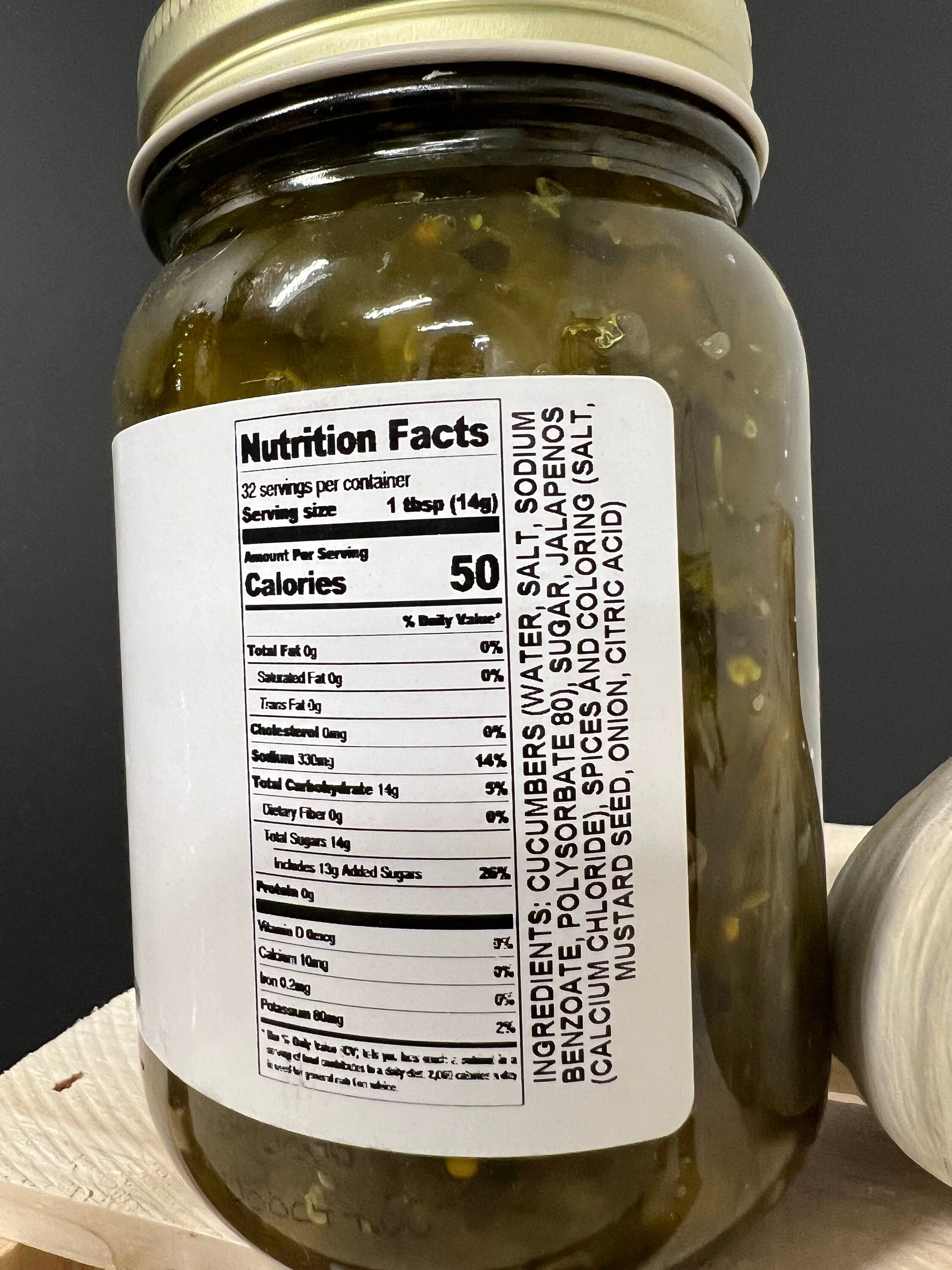 Ingredients: Cucumbers, Vinegar, Water, Jalapenos, Spices, Mustard Seed, Onion, Salt, Sugar, Soybean Oil, Citric Acid.